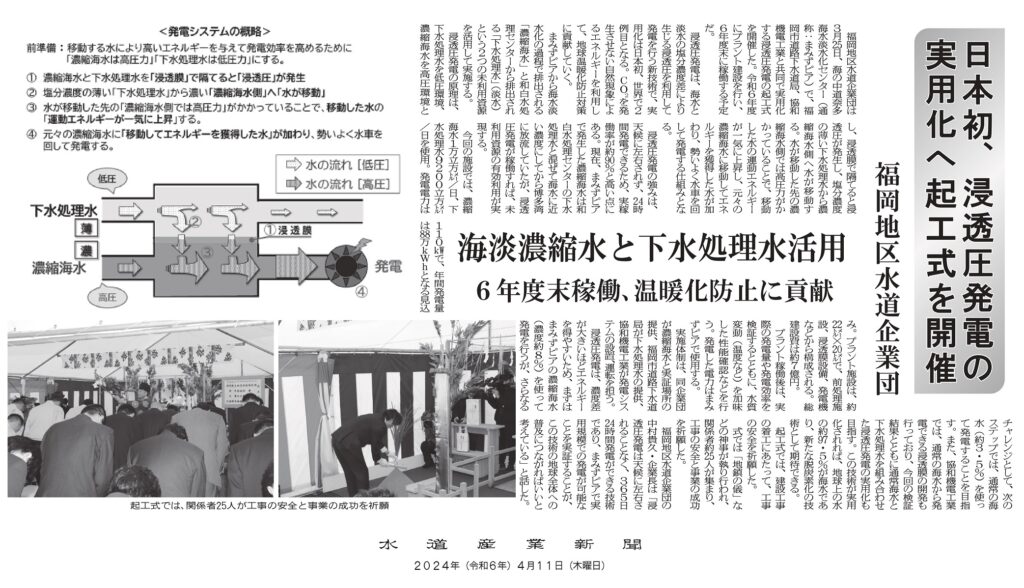 「浸透圧発電」実用化に向けた起工式について、新聞に掲載されました2024年4月23日2024年4月23日お知らせ 当社が福岡市と福岡地区水道企業団と共同で取り組んでいる「浸透圧発電」実用化事業に関し、3月にその起工式が開催されたことを受け、水道・下水道を中心とした水業界の総合専門誌である『水道産業新聞』に、記事として掲載して頂きました。 今後も、安全に配慮して本事業を推し進めるとともに、温暖化防止・脱炭素化への貢献に向けた技術の完成を目指してまいります。 出典:水道産業新聞 2024年4月11日発行 起工式(3月25日)の様子