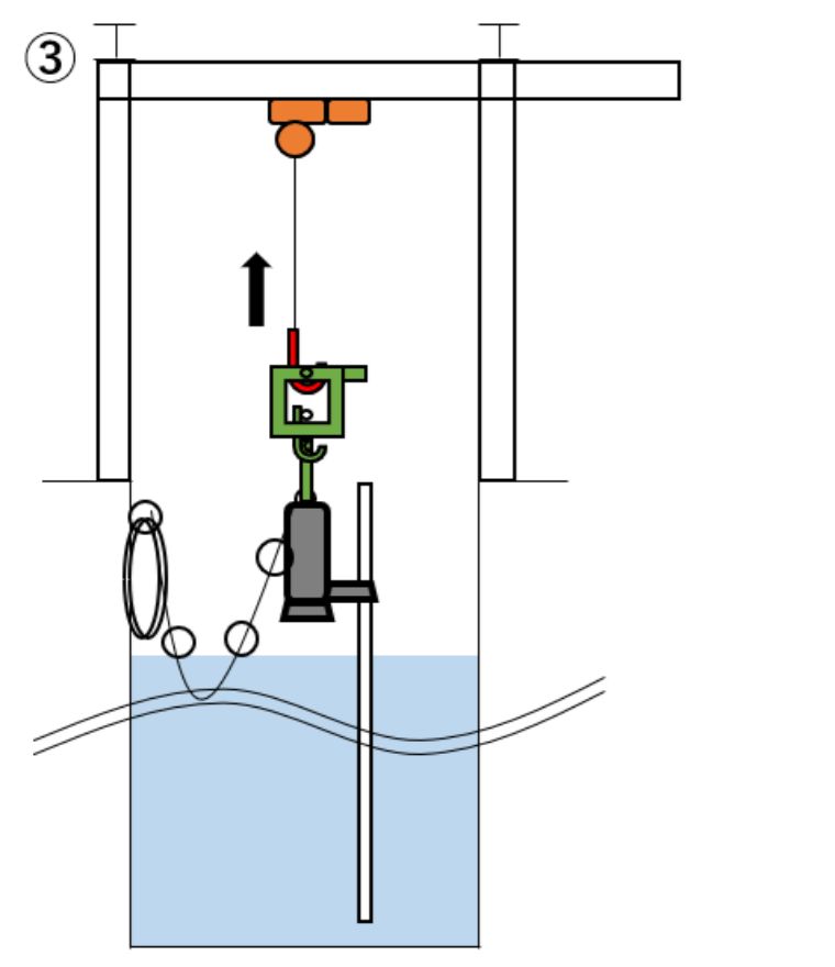 ③チェーンブロックを上げていくだけでポンプが地上まで上がってきます。