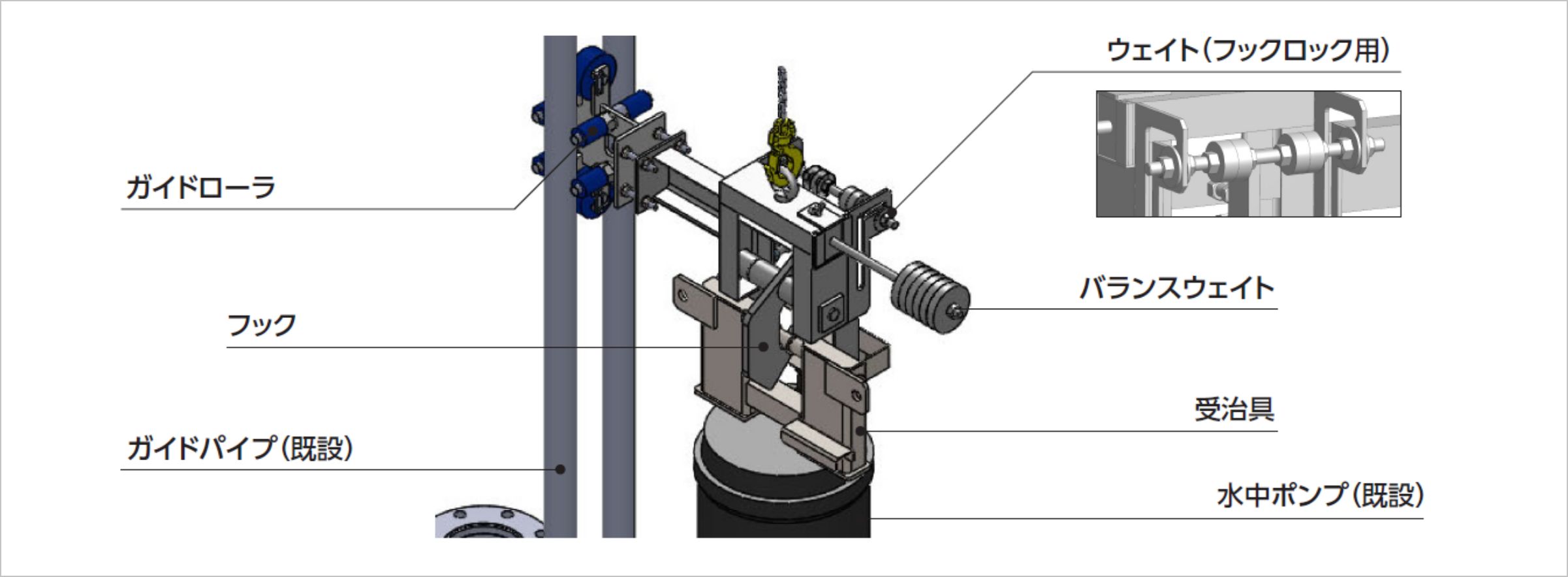 これからの水中ポンプのメンテナンスは、安全かつ効率的に!上・下水処理施設に設置されている着脱式水中ポンプの吊上げ・吊下げ作業が安全かつ効率的に実施できます。